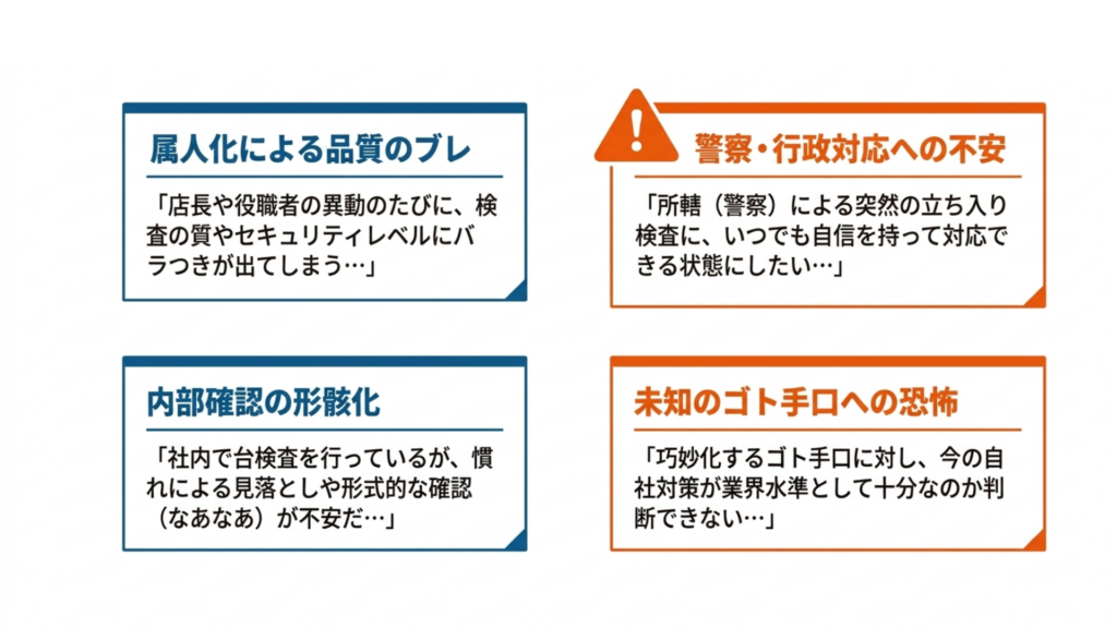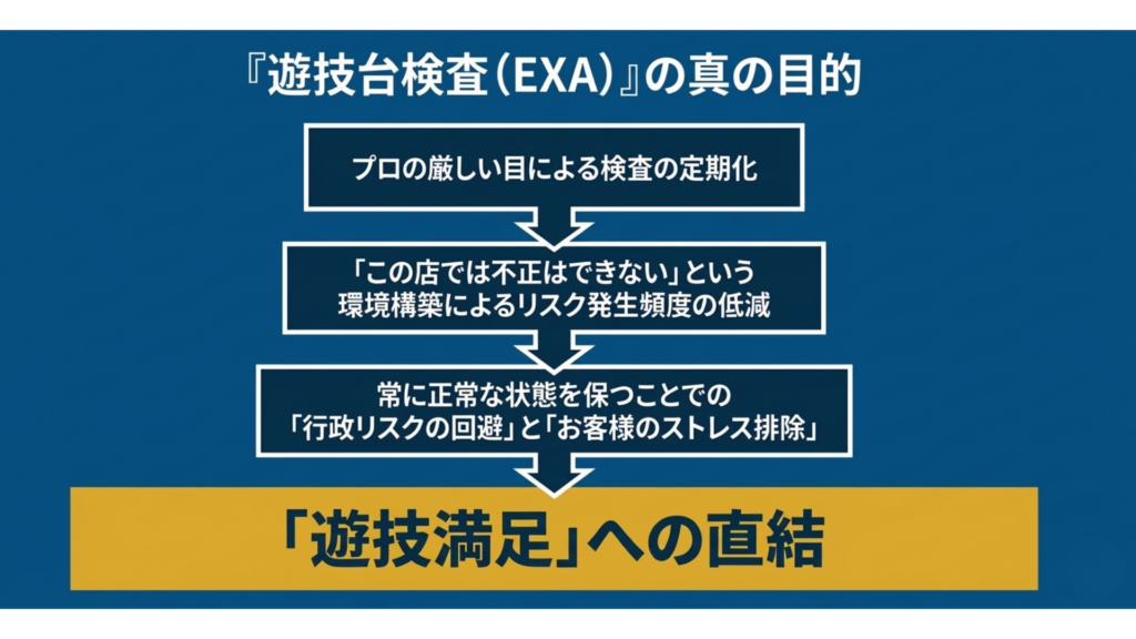 リスクの発生頻度を下げる “環境構築” のための遊技台検査は単に不正品を見つけて除去することだけではありません。